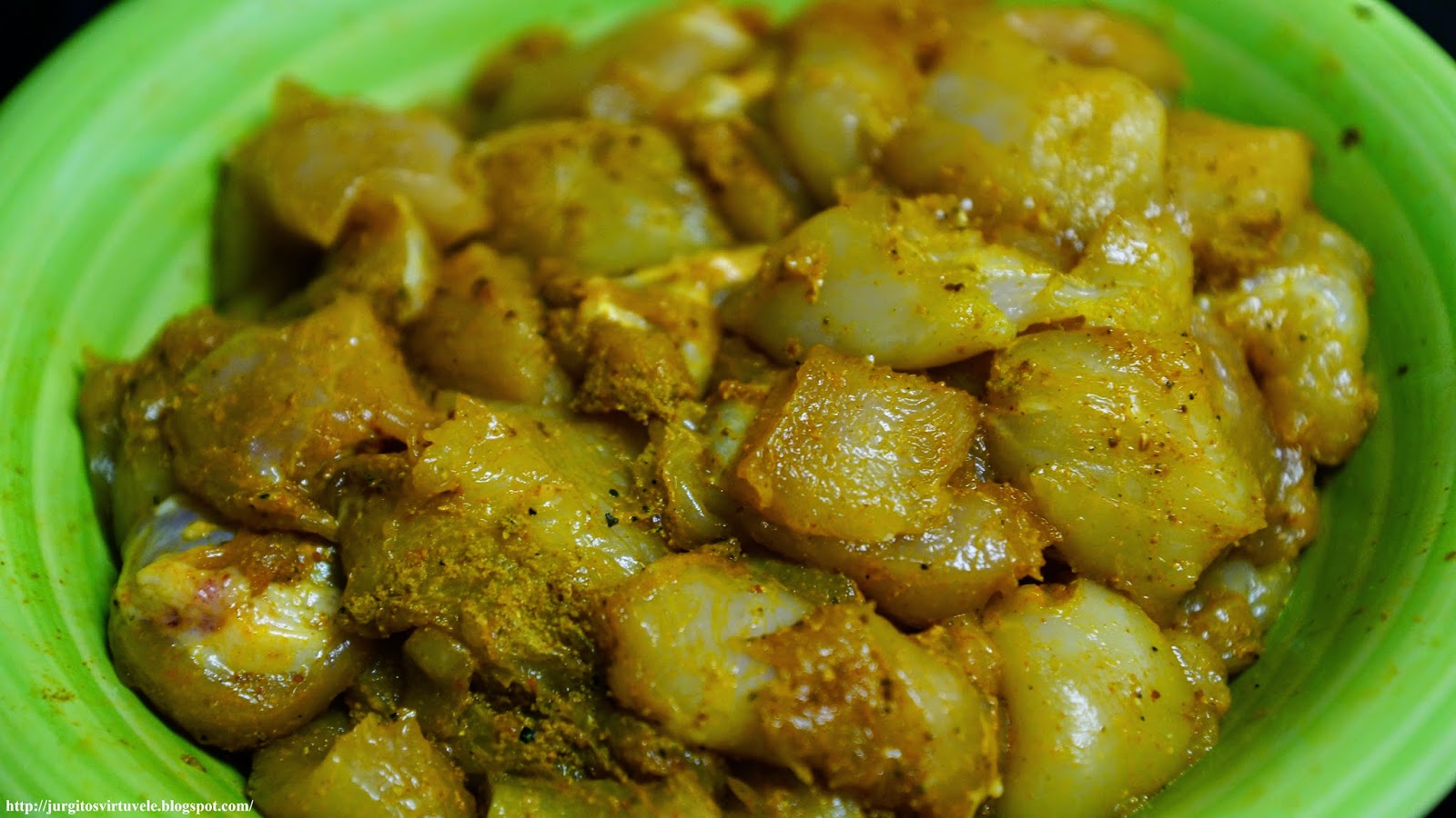 Kol mėsa marinuojasi, griežinėliais supjaustome papriką, likusias česnako skilteles, svogūnų laiškus (naudojame pagrinde jaunų svogūnų galvas ir tik dalį laiškų). Žiedeliais supjaustome pipirą.